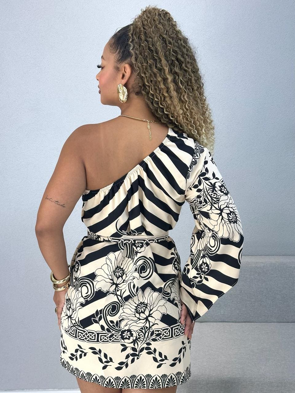 Busto 87 cm, cintura 97 cm, quadril 104 cm e comprimento 81 cm;